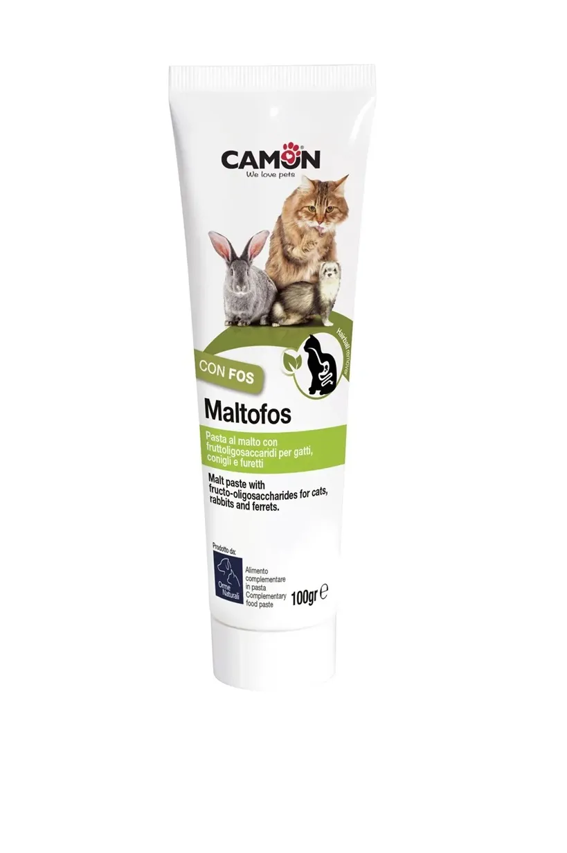Maltofos è un appetitoso alimento complementare per gatti, conigli e furetti che, aggiunto al cibo o somministrato direttamente, aiuta a mantenere il normale equilibrio della flora intestinale e favorisce l’eliminazione naturale dei boli di pelo inghiottiti.
