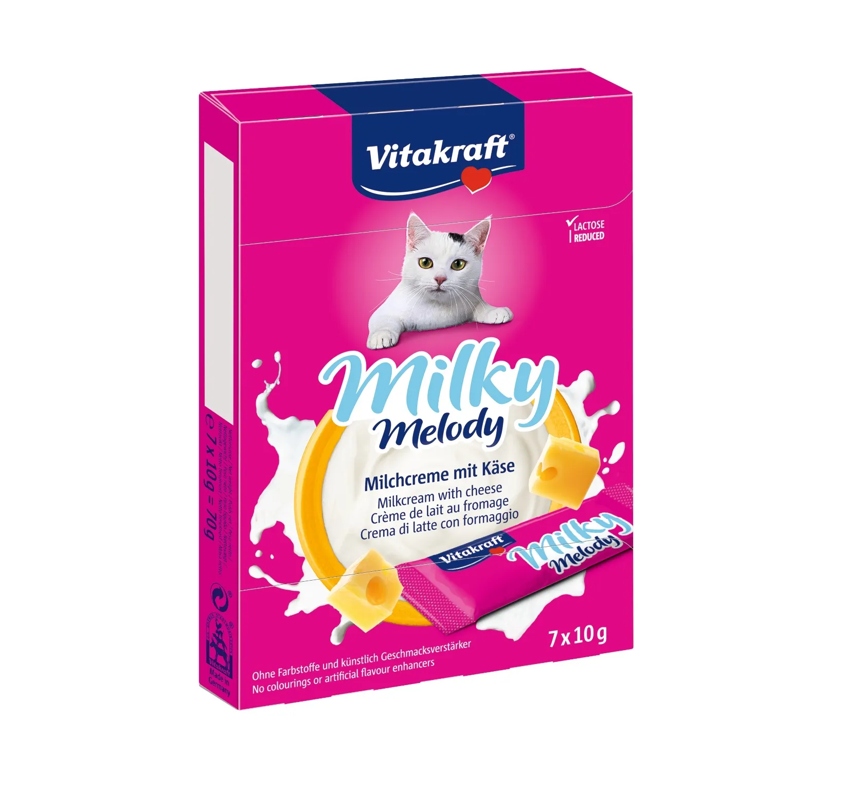 Vitakraft Cat Milky Melody formaggio è un delizioso fuori pasto da offrire al tuo micio. Prelibato alimento complementare al gusto formaggio, per rendere le vostre giornate con qualche coccola in più. Il formato è confezionato singolarmente così da non eccedere con le dosi e per garantirne la massima freschezza. Può essere consumato direttamente dalla confezione, sia dal dito che dalla ciotola del cibo. Non contiene coloranti né esaltatori di sapidità artificiali e con una ridotta quantità di lattosio. Contiene taurina che ha effetti benefici su vista e cuore.