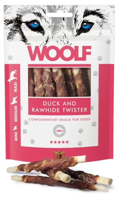 Questi Twisters di Anatra e Pelle Grezza sono realizzati al 100% con fonti proteiche per offrire la massima qualità e il miglior apporto nutrizionale. Lo snack Woolf, una volta cotto, è confezionato senza additivi chimici, conservanti o coloranti.