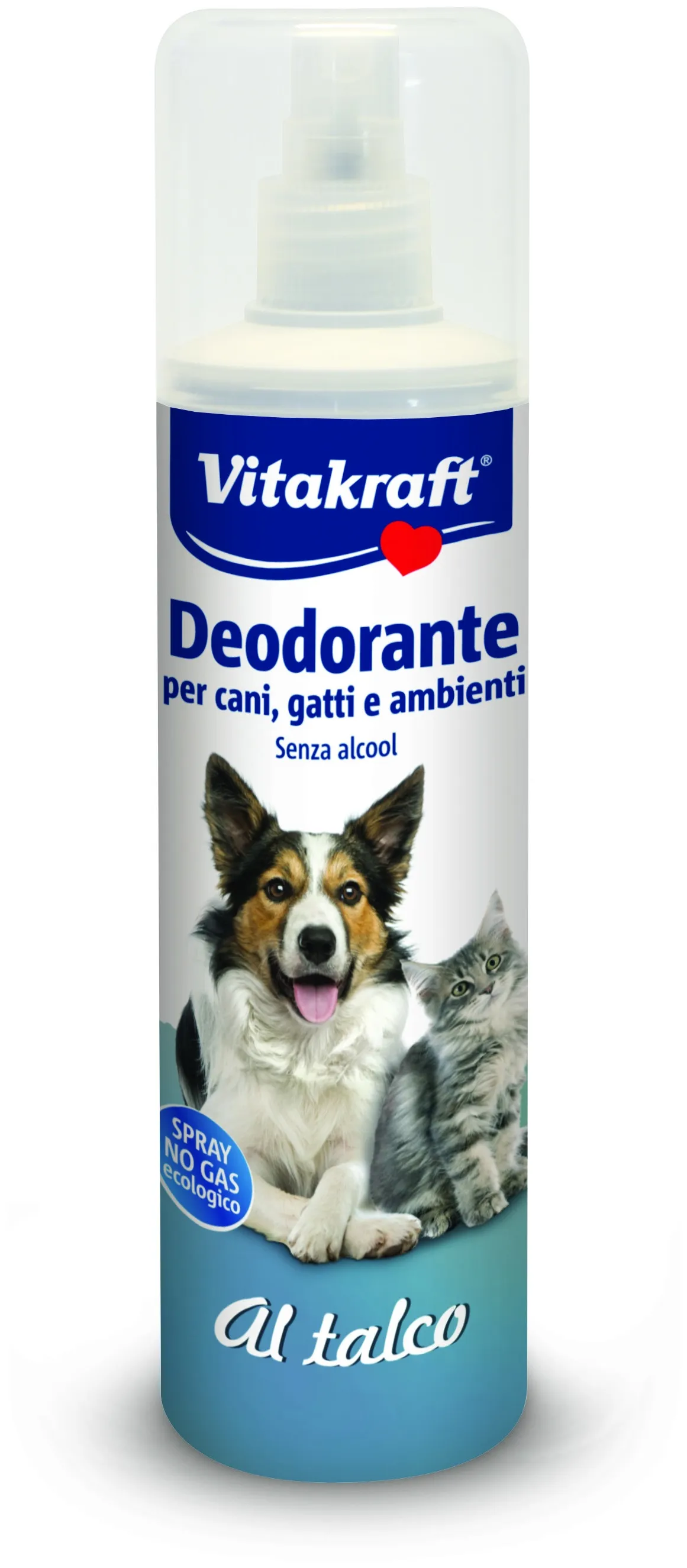 Vitakraft Spray deodorante al talco elimina efficacemente i cattivi odori distruggendo i batteri che li producono e lasciando sul pelo dell‘animale un profumo delicato e gradevole al talco. Senza gas propellenti.