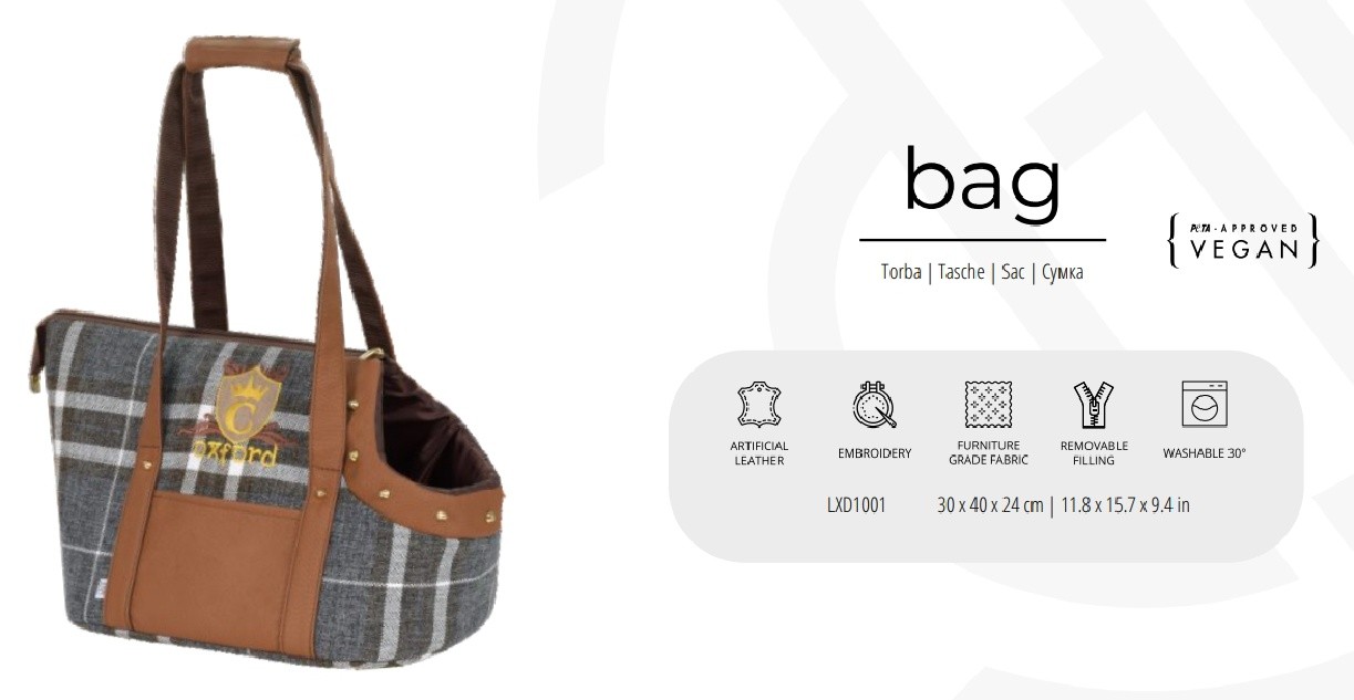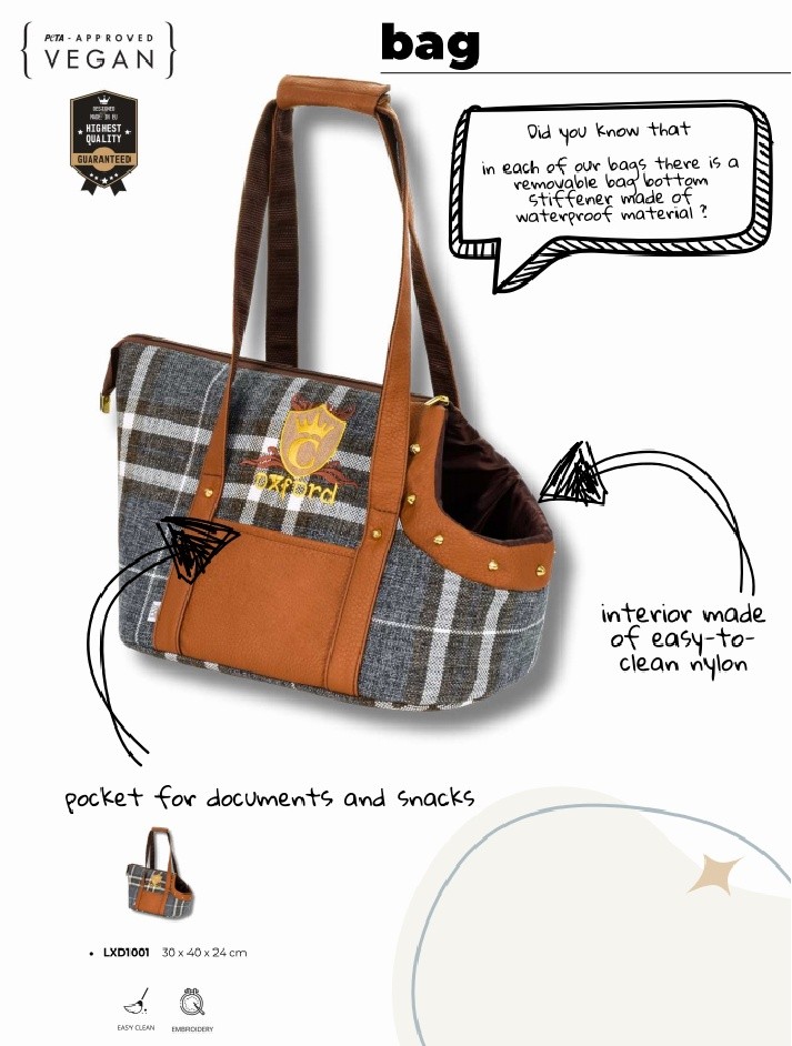 Comoda borsa realizzata in tessuto resistente a danni e sporco. Ogni volta che vi sposterete, garantiranno al vostro piccolo amico un trasporto sicuro. Materiali di alta qualità, combinazione di tessuto a quadretti e similpelle con ricami esclusivi.